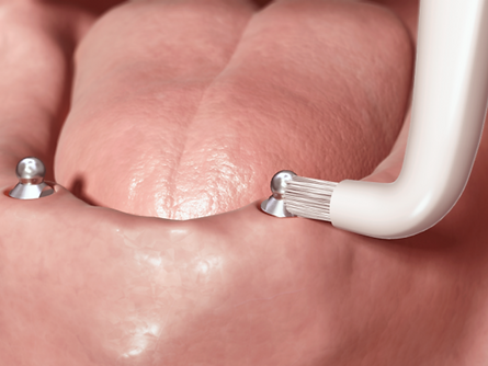 Under ser vi implantater med kulefester. Implantat og protese fungerer som trykknapper. Det fine med denne typen løsning er at man kan ta ut protesen for å lettere rengjøre, samtidig har du godt feste for protesen når du spiser og prater.